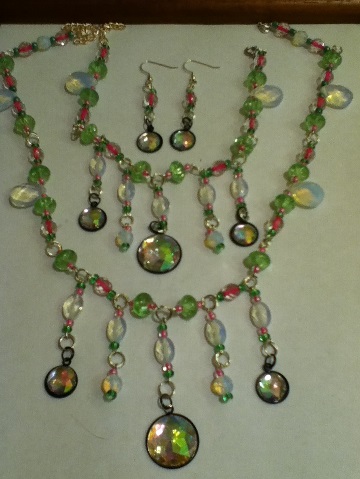 A hers and furry friend set.Lady style, green and pink disks. Opel drops and ovals. Cracked green glass.Crystal pink facets.
